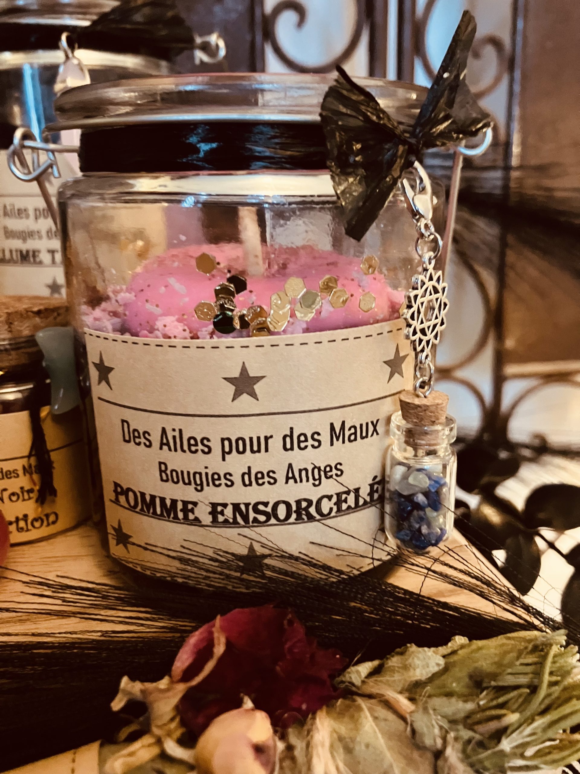 Une pierre et des plantes sacrées fabriquées par mes soins orne ta bougie.
