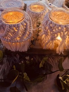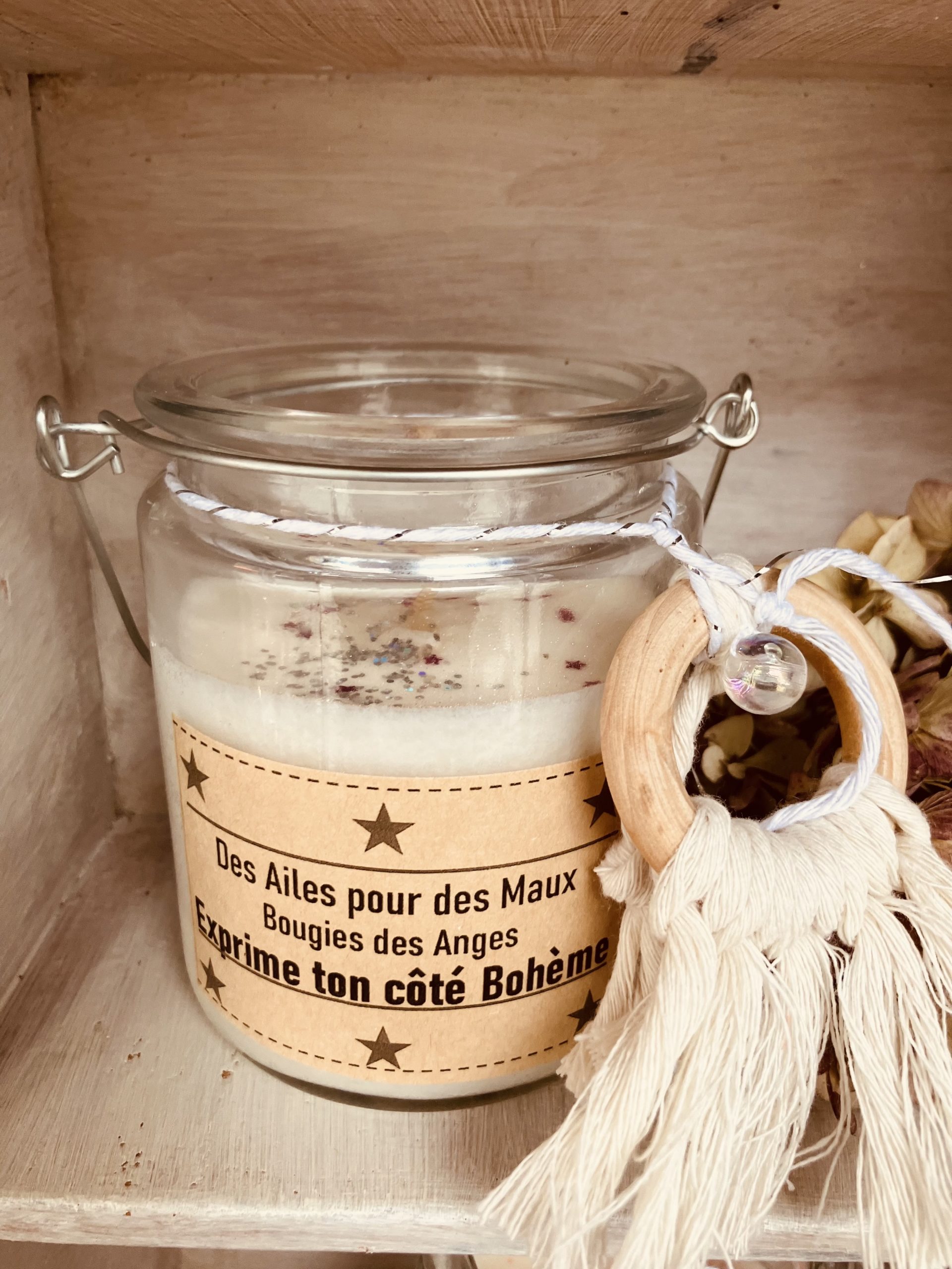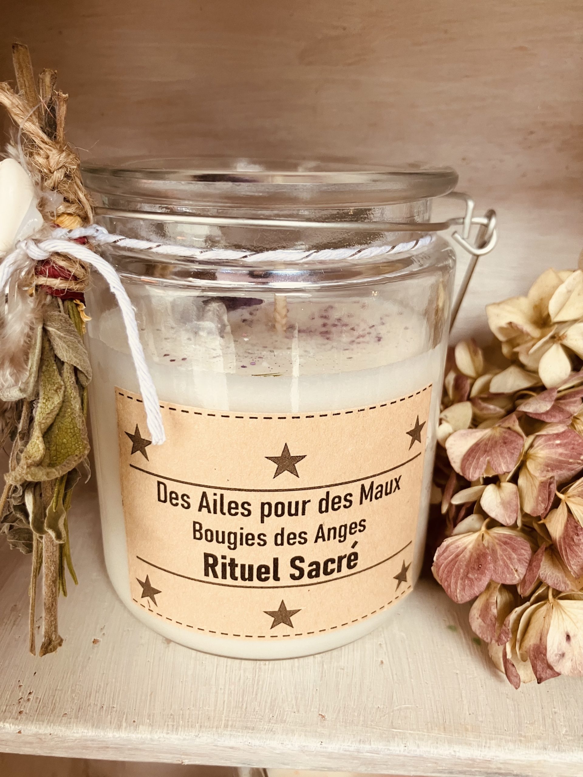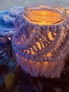 Un talisman en macramé réalisé par mes soins orne ta bougie.