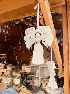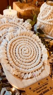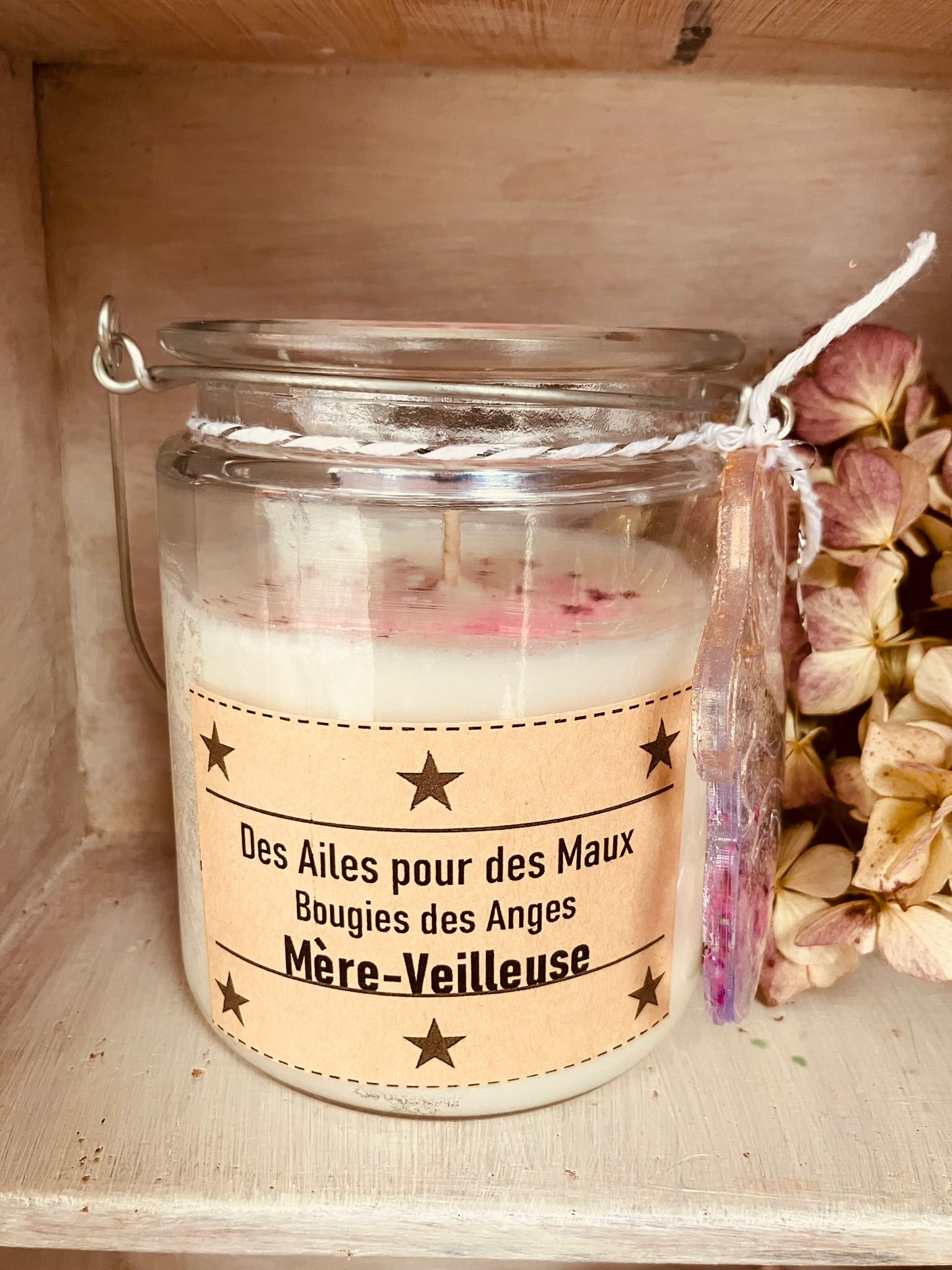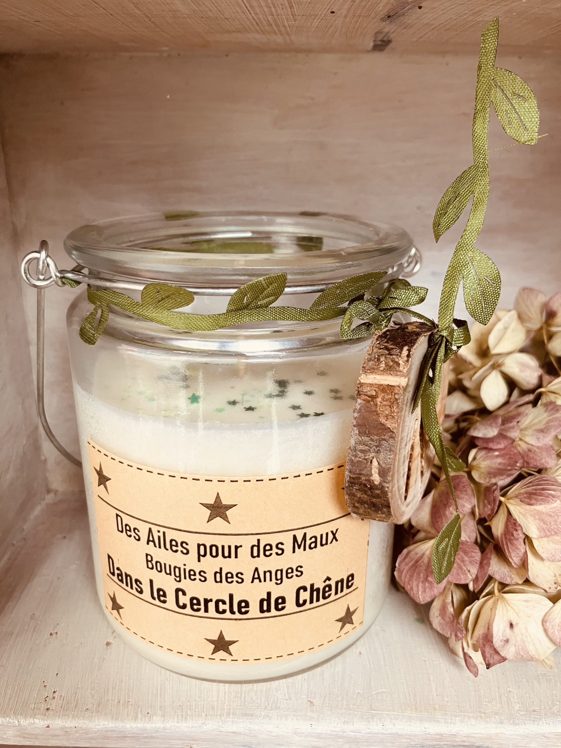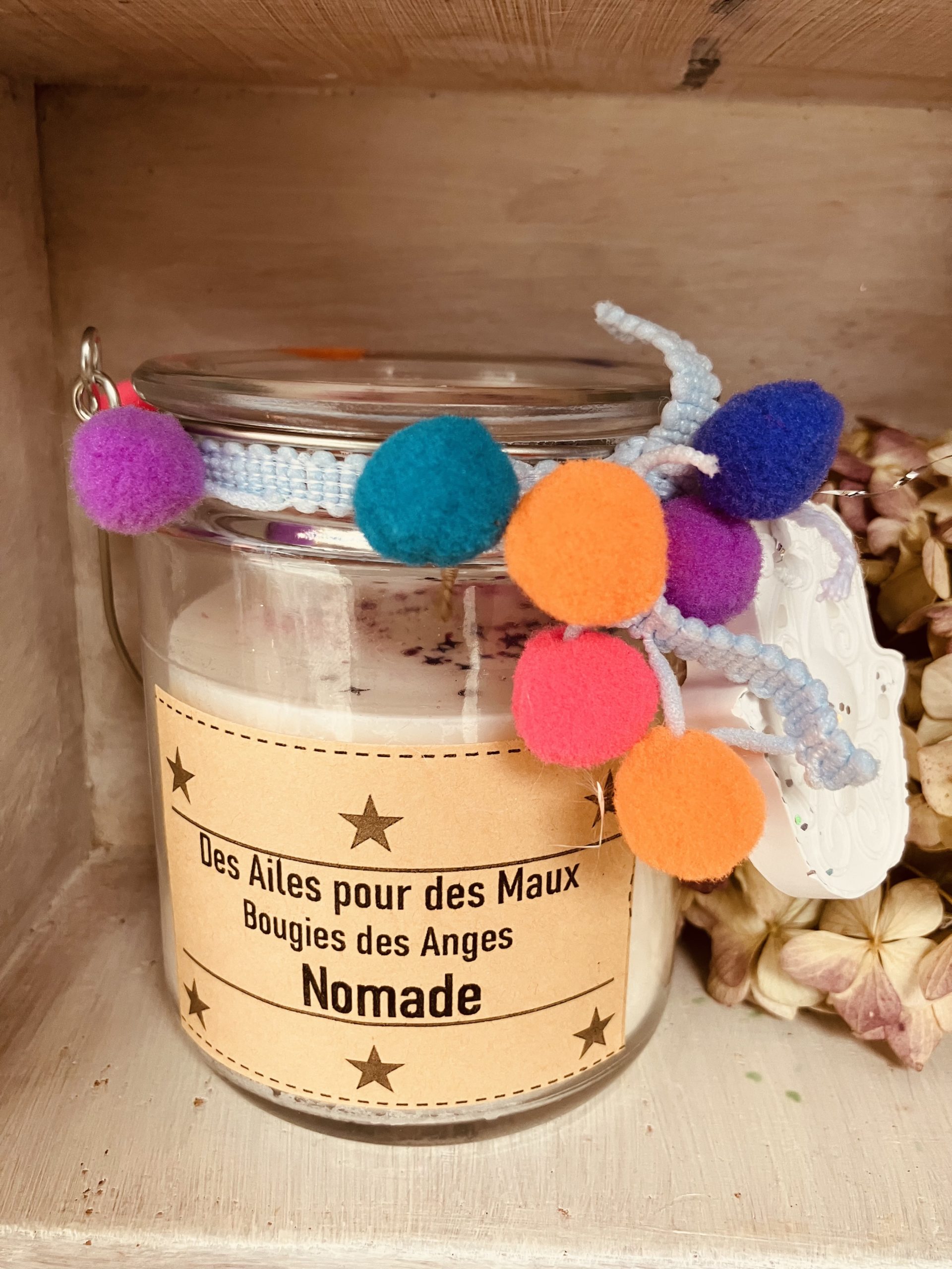 Un talisman en macramé réalisé par mes soins orne ta bougie.