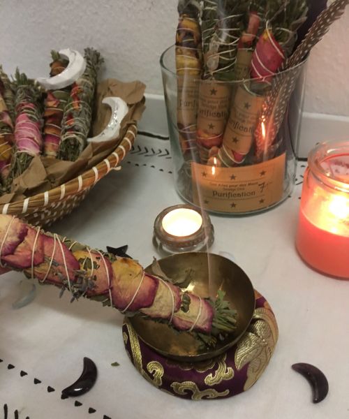 Commencez par vous ancrer, ressentez la connexion à la terre mère, posez vos intentions de purification et remplissez- vous de lumière blanche … Allumez un bâton de fumigation et balayer votre champ énergétique en répartissant avec une plume la fumée du smudge autour de votre corps du chakra coronal au chakra racine. Ce rituel a un effet purifiant et dissipe les énergies négatives et chasse « le mauvais œil ».