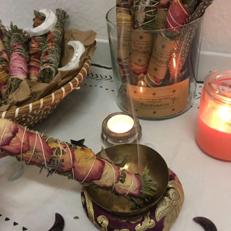 Commencez par vous ancrer, ressentez la connexion à la terre mère, posez vos intentions de purification et remplissez- vous de lumière blanche … Allumez un bâton de fumigation et balayer votre champ énergétique en répartissant avec une plume la fumée du smudge autour de votre corps du chakra coronal au chakra racine. Ce rituel a un effet purifiant et dissipe les énergies négatives et chasse « le mauvais œil ».